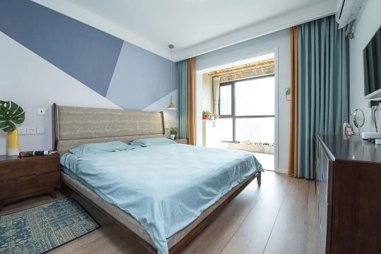 主臥簡潔清爽,背景墻格外設計了幾何造型,深藍,淺藍的組合,讓空間變得干練。幾何造型造價便宜,而且簡單大方又不呆板,性價比極高。陽臺與臥室連通,增加視覺寬敞與通透。窗簾安裝很美觀,顏色與主臥格調(diào)也很配。