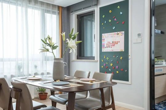 因為趕在優(yōu)惠期間,通屋貝殼粉,贈送了一面抗涂鴉的背景墻,可以當做黑板墻來使用,效果完全不差,不僅可以給孩子寫寫畫畫,還可以給餐廳帶來裝飾效果,空間不單調(diào)。