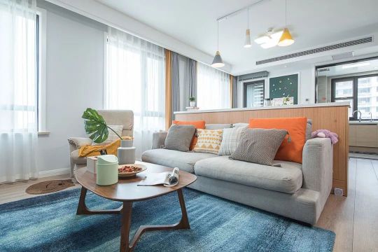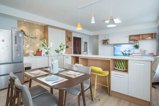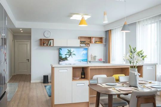 進門就是客廳,通屋大面積的選用了白色,加上幾扇大窗戶的光照充足,導致進戶格外的明亮。客廳中間做吧臺,看似雞肋卻發(fā)揮大作用,隔斷、沙發(fā)墻、收納一體。吧臺將客廳分隔開,功能獨立空間通透。沙發(fā)也有了倚靠,更有安全感。