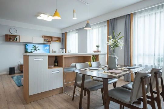 吧臺靠近餐廳一側(cè),擁有儲物功能,可以充當小型餐邊柜收納一些餐廳用品。中間鏤空設計提高座位舒適性,搭配兩把簡易吧臺椅,簡約有范。客餐廳采光好,窗簾依照功能區(qū)獨立設計,灰白色簡約時尚。