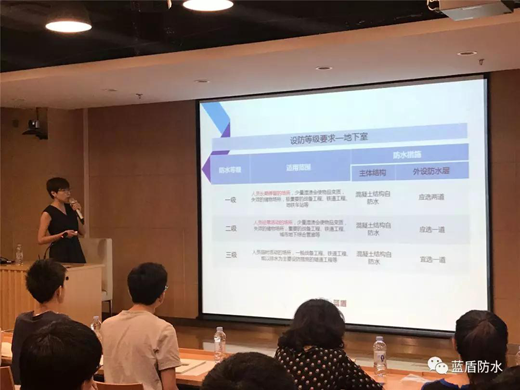 在瞿教授一番精彩的演講后,由藍(lán)盾防水總工程師王丹給設(shè)計(jì)師們帶來《防水工程設(shè)防與防水關(guān)鍵技術(shù)》的專業(yè)講解,和設(shè)計(jì)師們就“地下防水工程處理方案”、“屋面防水工程處理方案”、“室內(nèi)防水工程處理方案”三個(gè)大主題進(jìn)行技術(shù)交流。針對(duì)地下防水工程,藍(lán)盾倡導(dǎo)使用CPC非瀝青基高分子自粘膠膜系列防水材料。該類材料由HDPE片材、棕紅色非瀝青基自粘膠料、隔離膜或反應(yīng)砂層組成,采用預(yù)鋪反粘法使用,具有省時(shí)、省工、省錢的強(qiáng)大優(yōu)勢(shì),其抗竄水性能、抗穿刺性能遠(yuǎn)遠(yuǎn)超出標(biāo)準(zhǔn)值,為不漏工程提供了堅(jiān)實(shí)的保障。該材料及預(yù)鋪反粘的施工方法也是“2017年建筑產(chǎn)品十項(xiàng)新技術(shù)”之一、同時(shí)是“2018年建材工業(yè)鼓勵(lì)推廣應(yīng)用的技術(shù)和產(chǎn)品”。