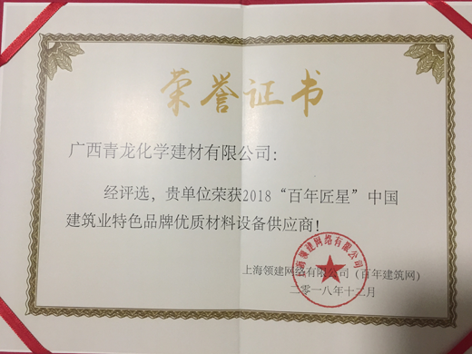 2018年12月13日,2019“中國建筑行業大宗材料采供模式創新高峰論壇”暨“百年建筑網年會”在上海隆重舉行。會上,青龍公司獲頒2018年“百年匠星”中國建筑業特色品牌優質材料設備供應商榮譽稱號。