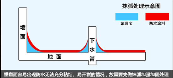 第二種是剛性防水,一般常見的就是堵漏寶,一般買柔韌性防水涂料的時候,里面都會送幾袋堵漏寶,主要目的就是節點的處理,比如衛生間邊角的處理,比如pvc落水管邊緣的處理,堵漏寶一般是快干的,現配現用,用的時候把這些邊邊角角易開裂的部位涂刷成圓弧狀即可。然后上面再刷上第一種柔性防水即可。