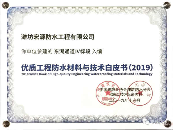11月15日,中國建筑業協會建筑防水分會2019年會暨防水產業鏈發展論壇在上海召開。會上,發布了《優質工程防水材料與技術白皮書(2019版)》,宏源防水參建的“東湖通道IV標段“項目入編。