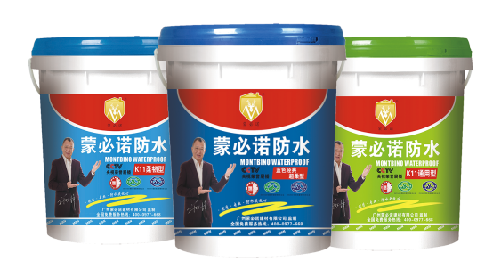 以業內口碑一向不錯的蒙必諾建材的防水涂料為例。蒙必諾的防水涂料有三種,K11通用防水、K11柔韌防水以及超柔防水。其中,“K11通用防水”就是滲透型,“K11柔韌防水”和“超柔防水”,都是覆膜型防水涂料。