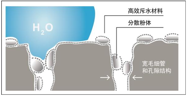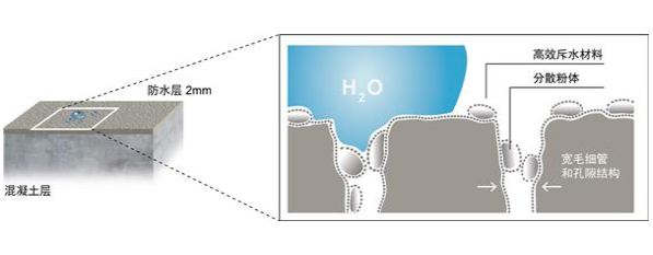 實際上,建筑的基礎表面無論是混凝土還是磚石,都被許多可見的孔隙密集覆蓋,這些孔隙的存在成為水侵入的窗口。傳統(tǒng)的室內(nèi)防水材料產(chǎn)品可以有效封閉原有基層的一些孔隙,但仍無法達到最佳防水效果。因為防水層本身有許多肉眼看不見的網(wǎng)狀毛細孔,這些毛細孔對水的吸收是毛細管作用的典型代表。