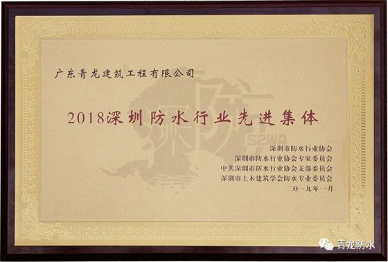 2019年1月9日,深圳防水協會2018年行業工作總結大會暨一屆三次會員代表大會上 ,青龍榮獲“2018年深圳防水行業先進集體獎”,彰顯了行業對青龍防水團隊實力及為行業所做貢獻的肯定與認可。
