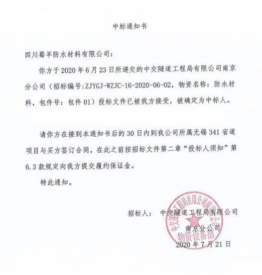 成功中標(biāo)中交隧道工程局有限公司南京分公司
