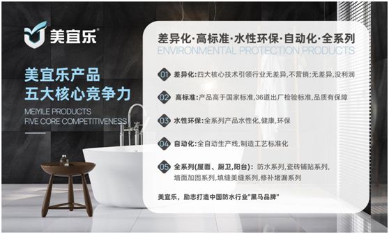 作為行業(yè)領(lǐng)先品牌,美宜樂早已把戰(zhàn)略目光投向這片藍(lán)海,不斷加大產(chǎn)品研發(fā)力度,重視產(chǎn)品前瞻性布局,形成了防水、防水卷材、堵漏、填縫料、瓷磚膠等多個(gè)系列的產(chǎn)品矩陣,并成為行業(yè)產(chǎn)品體系最齊全的廠家之一,可為客戶提供一站式解決方案。目前,美宜樂正以四大維度實(shí)現(xiàn)行業(yè)領(lǐng)跑,以強(qiáng)勁實(shí)力助您解鎖財(cái)富商機(jī),實(shí)現(xiàn)“大商夢(mèng)”。