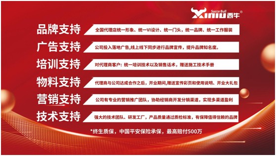 西牛建材不僅在研發技術與品質管控力量上為合作商提供強有力的保障。同時,在服務上,西牛推出了“成長護航機制”,充分保障空白市場伙伴權益;6大終端扶持系統,品牌、廣告、培訓、物料、營銷、技術多位一體,以最簡單實用的運營工具、最前瞻的營銷思維全過程指導幫扶,賦能終端,助力合作伙伴們輕松賺錢,實現財富夢想。