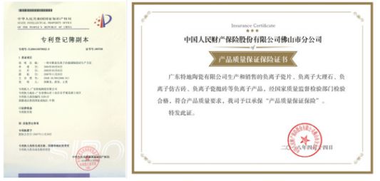 負(fù)離子瓷磚國家發(fā)明專利證書(左)和負(fù)離子瓷磚具有相關(guān)保險(xiǎn)證書(右) 產(chǎn)品質(zhì)量更為可信所以在挑選值得買的負(fù)離子瓷磚時(shí)候,要看清楚負(fù)離子瓷磚發(fā)明專利證書、產(chǎn)品質(zhì)量保證保險(xiǎn)證書、負(fù)離子瓷磚相關(guān)檢測報(bào)告!如果發(fā)現(xiàn)宣傳上過多強(qiáng)調(diào)“殺菌消毒、有助睡眠、改善神經(jīng)衰弱、失眠,通暢心腦血管,降低血液粘稠度,提高人體免疫力”等等各類概念,可要提高警惕辨別真相。