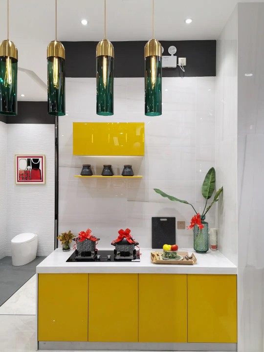 亮光墻磚“星白”打造的廚房空間,清新雅致,與顏色鮮明的黃色調形成鮮明的對比,驚艷視覺。