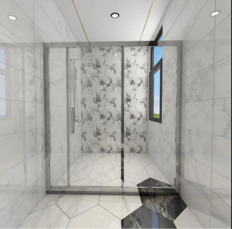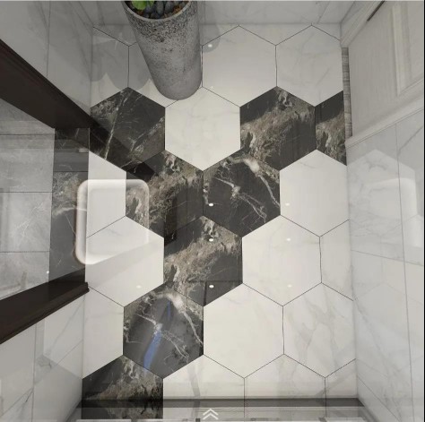 二層衛(wèi)生間采取了干濕分區(qū)的布局,墻磚選用“爵士白”一開(kāi)三上墻鋪貼,純凈清爽的“爵士白”,質(zhì)感非常強(qiáng);300*800mm“卡薩布蘭卡”花磚點(diǎn)綴墻磚,把大自然的元素帶回家,享受這種自然舒適的感覺(jué);地磚在鋪貼時(shí),設(shè)計(jì)師加入了自己的一些小創(chuàng)意,把淺色系的“爵士白”和深色系的“黑布林”切割成六角磚,“黑布林”的小范圍點(diǎn)綴,個(gè)性又時(shí)尚。