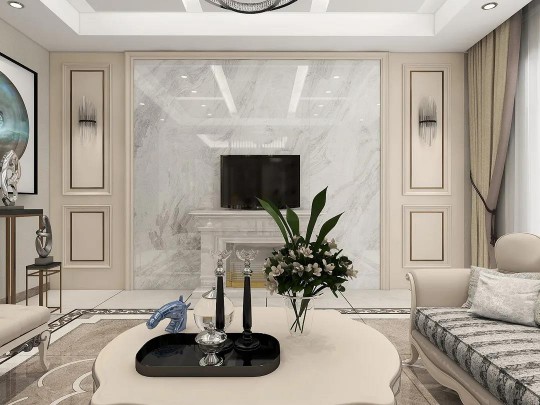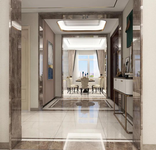 整個(gè)居室的公共區(qū)域地面統(tǒng)一選擇了伊莉莎白900*900mm規(guī)格的“維納斯”和“索瑪棕”組合搭配,把“維納斯”的浪漫情懷與“索瑪棕”的高貴典雅融入空間,打造極具格調(diào)的歐式輕奢范;搭配現(xiàn)代裝飾畫(huà),古銅金屬線(xiàn)條點(diǎn)綴,提升空間檔次。