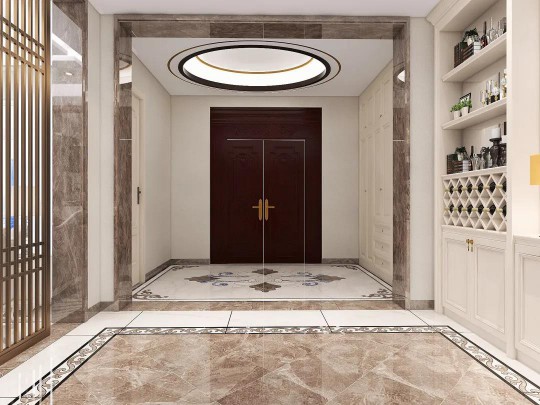 為了豐富空間的層次感,設(shè)計(jì)師在設(shè)計(jì)本項(xiàng)目時(shí)做了很多細(xì)節(jié)上的處理,例如,在整個(gè)一層空間,你可以看到很多地方都使用了波打線(xiàn),不僅美觀還起到劃分功能區(qū)域的作用;同樣的兩款地磚,卻通過(guò)不同的造型切割,打造出各具特色的拼花圖案,讓空間更具設(shè)計(jì)感。