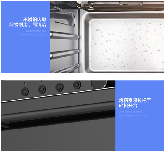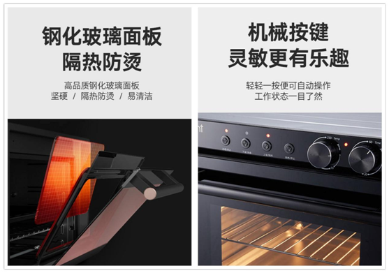 上室烤箱配置不銹鋼內膽,在耐高溫、抗腐蝕、性能穩定、不易生銹之余,更方便消費者日常清洗,有效保證內部的潔凈度;采用高品質的鋼化玻璃面板,具有硬度高、耐熱性好等優勢,對防止熱炸裂有明顯的效果;配備靈敏的機械按鍵,輕輕一按便可實現自動操作,智能生活輕松享;裝有堅固的易拉把手,輕松一拉,便能實現烤箱門的自由開合。