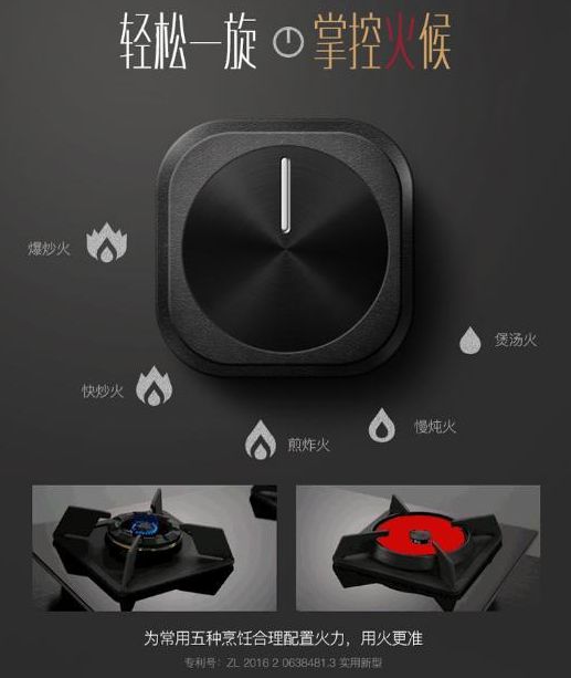 通過旋鈕,就可以輕松選擇不同的火候火力模式:爆炒火、快炒火、煎炸火、慢燉火和煲湯火,即使烹飪者對菜式的火候不是特別熟悉,按照旋鈕的精準火力進行設置,就可以輕松應對了。