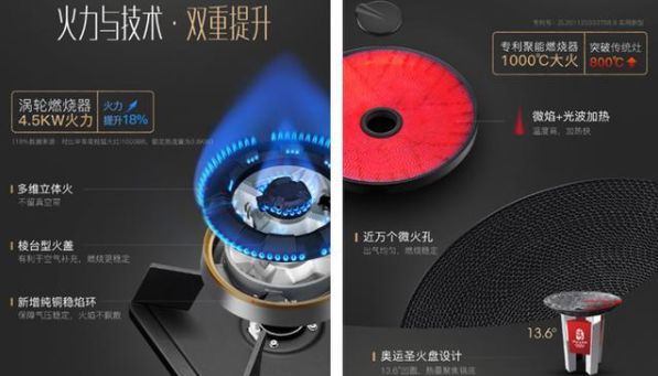 先不說不同爐頭的雙眼灶有什么好處,我們先來看下這兩個爐頭的優(yōu)良燃燒性能。華帝鴛鴦灶左邊爐頭是渦輪燃燒器,產(chǎn)生環(huán)形立體火焰(屬于直火灶類型),這種爐頭火焰均勻,熱力穩(wěn)定,大火猛烈,小火也不易飄散;右邊是華帝聚能灶,采取合金體的蜂窩燃燒器,近萬個微火口均衡輸出紅色烈焰,加上奧運圣火盤的凹型聚能光波,火力劇烈,加熱速度更快。
