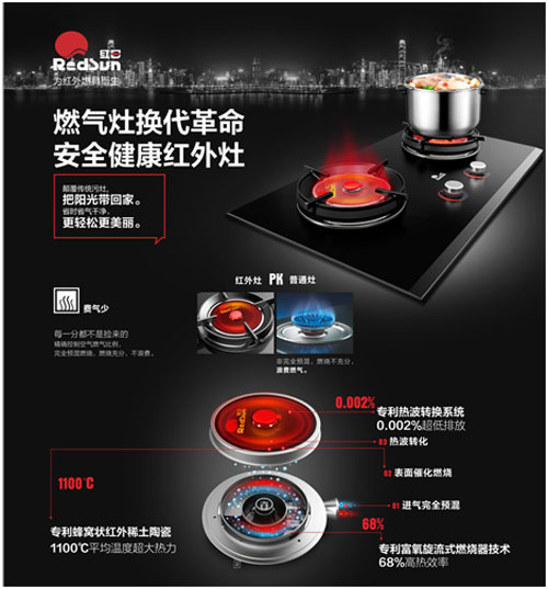 “一年能省4個月煤氣”,紅日家用紅外線燃?xì)庠睿切袠I(yè)與消費者公認(rèn)的良心灶。技術(shù)領(lǐng)先的紅日燃具作為廚衛(wèi)行業(yè)領(lǐng)導(dǎo)品牌之一,成立于1981年,是國家級高新技術(shù)企業(yè),燃?xì)庠顕覙?biāo)準(zhǔn)起草單位等。紅日燃具擁有深厚的技術(shù)底蘊,“高紅外發(fā)射率多孔陶瓷節(jié)能燃燒器技術(shù)”顛覆性突破傳統(tǒng)火焰式灶具,榮獲中國馳名商標(biāo)、國家重點新產(chǎn)品等大獎無數(shù)。更成為首個同時獲中國設(shè)計最高獎“紅星獎”、德國IF設(shè)計大獎的中國燃?xì)庠钇放啤?/p>