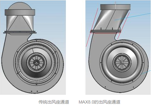 一體式設(shè)計(jì)的出風(fēng)座與蝸殼內(nèi)腔形成完整擴(kuò)壓通道,最大限度減少了出口紊流現(xiàn)象,杜絕了氣流倒流、漩渦等現(xiàn)象,使出風(fēng)順暢,減少風(fēng)量損失,增強(qiáng)風(fēng)壓。