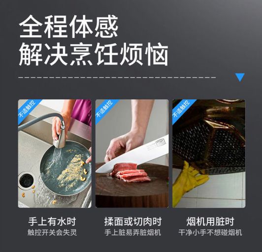 當手上沾滿油污又不方便操作煙機時,可以喊出小智幫忙調節煙機風量大小和開關機、照明等功能,隔空操控油煙機更方便干凈衛生。
