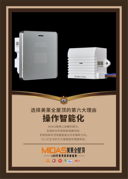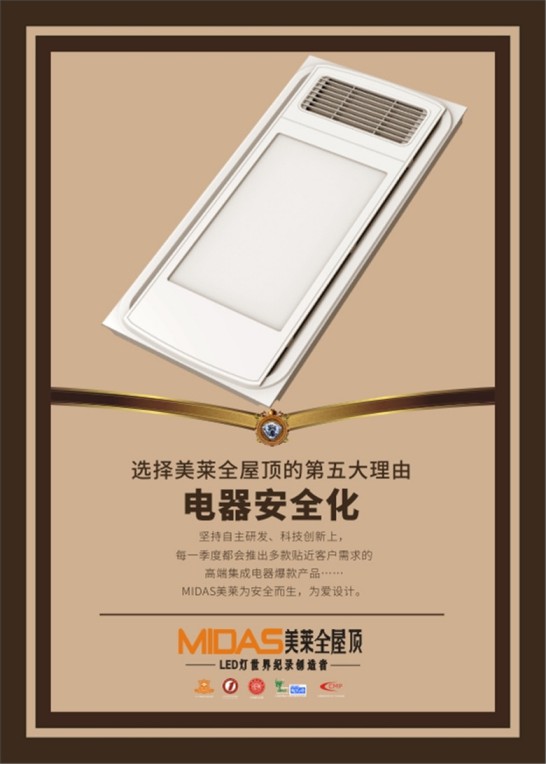 MIDAS美萊全屋頂,不僅在扣板方面匠心專注,在集成電器領域亦是潛心研究,努力為消費者們解決一個又一個難題,為其創(chuàng)造一個安全舒適的居家環(huán)境。在堅持自主研發(fā)、科技創(chuàng)新上,不敢有絲毫懈怠,每一季度都會推出多款貼近客戶需求的高端集成電器爆款產品。如特種微晶輻射防爆玻璃、耐溫達到800度的美萊碳纖維取暖電器,秒速升溫,安全放心;美萊新一代浴室抗寒神器“雙區(qū)空調(六合一),采用高端納米陶瓷PTC取暖,升溫迅速,干濕區(qū)同時送暖,智能溫控多重安全保護,一臺電器頂2臺;美萊LED世界紀錄燈,節(jié)能防水“高壽”,真正做到10年不換燈……MIDAS美萊為安全而生,為愛設計。