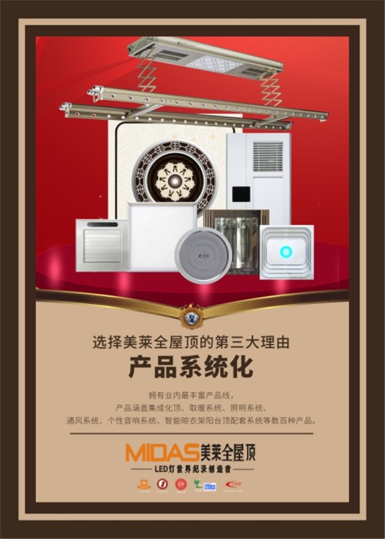 MIDAS美萊擁有業(yè)內最豐富的產品線,產品涵蓋集成化頂、取暖系統(tǒng)、照明系統(tǒng)、通風系統(tǒng)、個性音響系統(tǒng)、智能晾衣架陽臺頂配套系統(tǒng)。數百種產品完全可根據消費者的設計要求量身定制,能hold住消費者的全部頂飾需求!