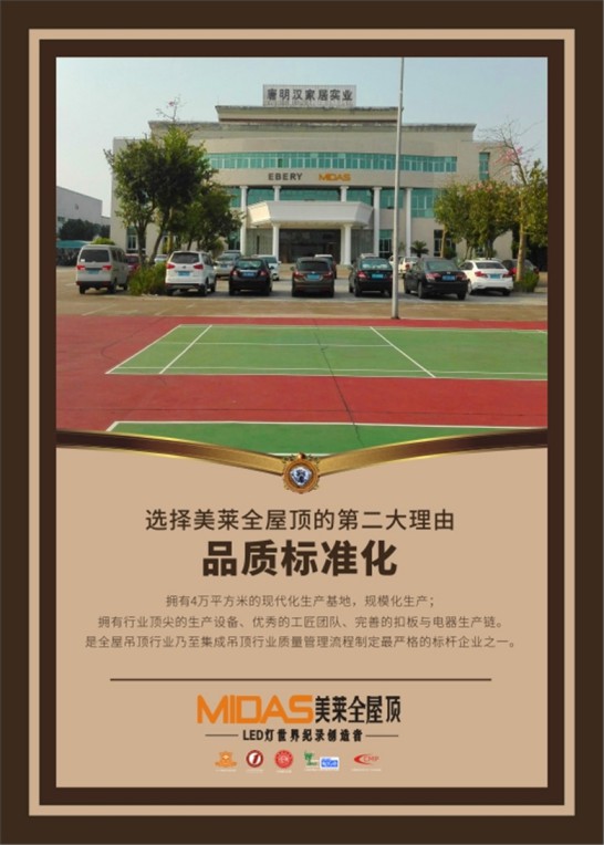 成立于1986年的MIDAS美萊,擁有4萬平方米的現(xiàn)代化生產基地,擁有行業(yè)頂尖的生產設備、優(yōu)秀的工匠團隊、完善的扣板與電器生產鏈。天花扣板在造型設計、工藝水準、材質選用、安裝流程等各方面都有嚴謹的標準體系,且更加注重美學品位。是全屋吊頂行業(yè)乃至集成吊頂行業(yè)質量管理流程制定最嚴格的標桿企業(yè)之一。多年來,MIDAS美萊以其創(chuàng)新的技術、出眾的產品和令人信賴的品質,深受大眾喜愛。