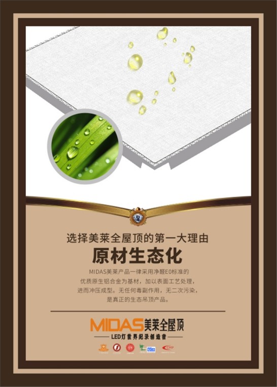 MIDAS美萊產品一律采用凈醛E0標準的優(yōu)質原生鋁合金為基材,加以表面工藝處理,進而沖壓成型。無任何毒副作用,無二次污染,是真正的生態(tài)集成吊頂產品。從嚴謹有序的研發(fā)生產,到選用最環(huán)保的原材,每一個細節(jié),每一個設計,都承載著無數美萊人的堅守和執(zhí)著,這是對每一個消費者的保障,也是對每一個家庭的保護。