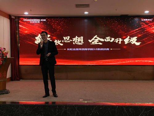 在第一天會上,長虹全屋吊頂事業部運營總監陳令先生,首先對公司員工以及經銷商們表示了感謝,接著發表了“新家居常態下的品牌思考”為主題的精彩演講。議程中,他重點提出了“解放思想,決勝終端“的發展戰略目標,堅定不移地將長虹全屋吊頂打造成讓老百姓買得放心,用得放心的全屋吊頂消費者品牌, 贏得了現場經銷商們的連連好評,掌聲不斷。