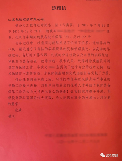 十年品質(zhì)堅(jiān)守,兆勝始終如一,在今后的十年、二十年…兆勝空調(diào)將不忘初心,繼續(xù)科技創(chuàng)新,以更優(yōu)質(zhì)的產(chǎn)品、更專業(yè)的技術(shù),服務(wù)海軍,為國家裝備事業(yè)的發(fā)展作出應(yīng)有的貢獻(xiàn)!