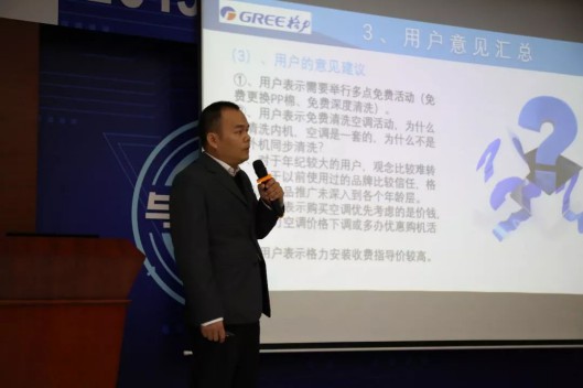 佛山格匠機電工程有限公司廖中健負責人通過強有力的調研數據,展示了用戶對格力空調產品的了解程度,對格力空調服務質量的認可程度,傾聽用戶心聲,想用戶所想,急用戶所急。同時他表示要有敢于從雞蛋里面挑骨頭的想法,整合格力空調工程師的意見,推陳出新順勢而為,服務規范化的道路持續不斷地向前推進。