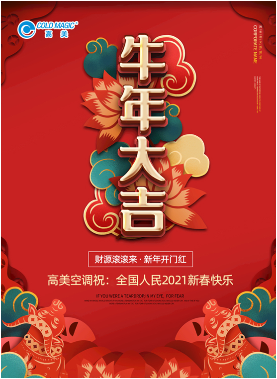 如今,在這辭舊迎新的重要時刻,廣東高美空調設備有限公司特別向多年來為企業的發展艱苦奮戰的全體員工,向與高美并肩作戰、共同成長的加盟商、合作伙伴,以及始終關心高美的建設與發展的社會各界朋友,致以衷心的感謝與誠摯的祝福。祝大家在新的一年里,萬事如意、事事順心、步步高升、大展鴻圖!