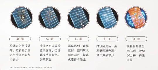 在啟動56℃凈菌自潔模式后,空調會在室內機凈菌后自動進入室外機自潔階段,通過結霜、化霜等步驟對室外機進行深層清潔。