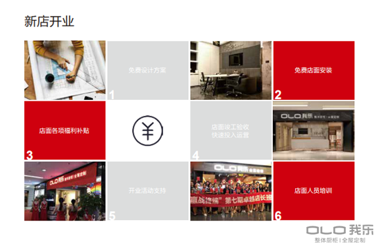 6步助經(jīng)銷商快速開店,包含完全免費設(shè)計方案、完全免費店面安裝、店面各類福利補貼、店面工程驗收快速投放運營還有開業(yè)活動支撐、店面人員管理。利用這6步幫扶支撐,我樂家居幫助進入我樂全屋定制經(jīng)銷商讓店鋪快速走上正軌。