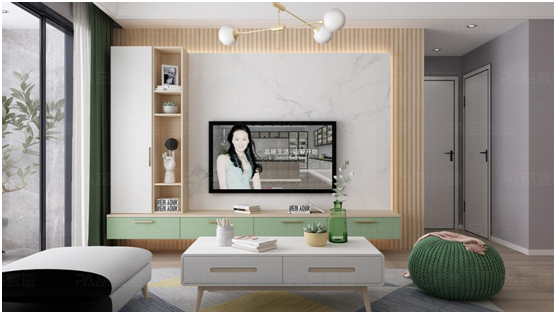集自然之美、天地之靈,將自然特點融入空間設計。品愛挪威春天系列,以大片天然灰調石紋形成背景單色,然后用雪花白大理石電視墻打碎空間的沉悶,用現代的藝術手法,打造充滿藝術感和設計感的美學空間。客廳多組功能組合,媽媽看著電視,孩子在地臺上玩耍,爸爸靠在飄窗上看著書,仿佛陽光在訴說著幸福的一家。