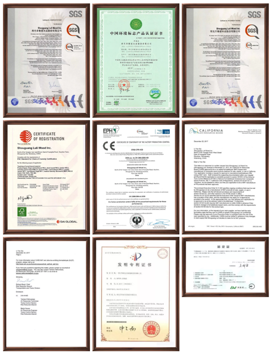 同時還獲得中國環境標志產品認證、 FSC/COC國際產銷監管鏈體系認證、美國CARB認證、日本JAS認證、SGS國際認證、歐盟CE認證、美國無醛豁免NAF認證及美國環保署EPA認證等多重國際認證。