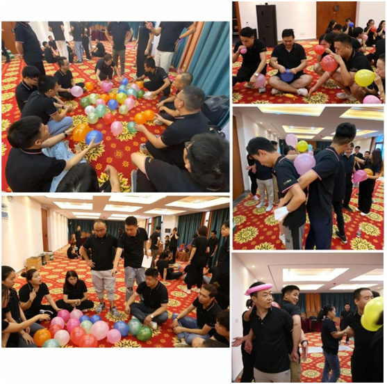 在比賽過程中,團隊分為四個小組進行積分制PK比賽,比賽項目有:團隊士氣展示、頭頂水瓶、后背傳字、吹氣球頂氣球,以完成正確率+時效作為考核標準。