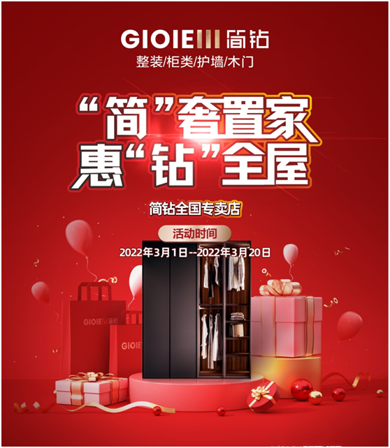 系列套餐鉅惠活動霸氣來襲,衣櫥柜套餐、門墻柜一體定制套餐等鉅惠套餐應有盡有,價格優惠之余,簡鉆還為你推出多重讓利政策。(活動詳情請以簡鉆全屋定制家居門店為準)