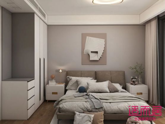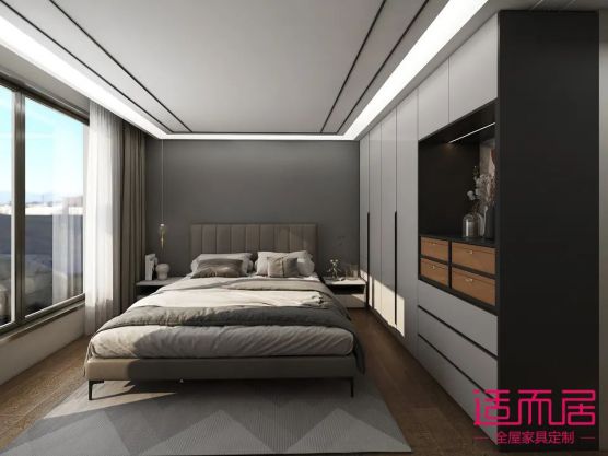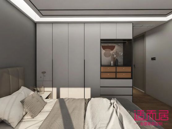 主人房已灰色調為主色調,迎合了房子主人對高級感的需求,莫蘭迪灰的衣柜+灰色的床+灰色乳膠漆的床背景墻,高級感滿滿。