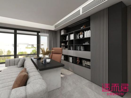 橫廳的戶型,沙發背面留部分區域做辦公區域,書柜的整體以開放格為主,搭配格柵和莫蘭迪灰的設計,時尚又實用。