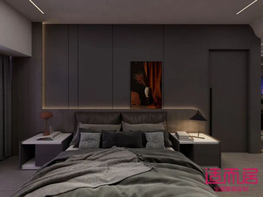床頭采用柜墻門一體的設計,背景墻設計與房間門融為一體,頂面無主燈設計,整體都透露著設計感,科技感~