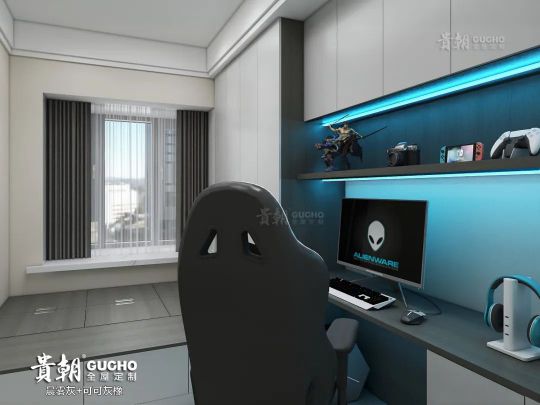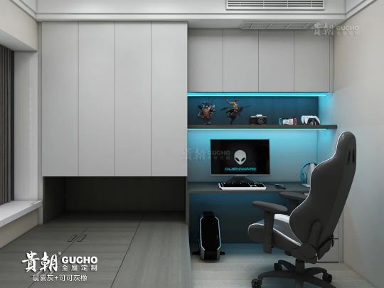 擁有一間電競房,是每一位電競愛好者的追求。男主人是一名重度電競愛好者,喜歡打游戲、看比賽,因此,小次臥被設計成了榻榻米兼電競房,簡單的書桌,舒適的電競椅,成套的鼠鍵耳機,藍色的燈光設計營造出酷炫的未來科技感,氛圍感直接拉滿。