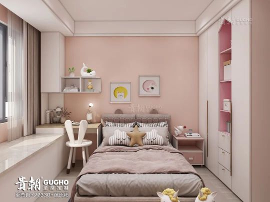 夢幻粉的兒童房,充滿了童趣。整體色彩采用了粉紅色+白色+原木色的搭配,給人一種溫馨舒適的感覺。另外,衣柜做了一個別致的造型,豐富了空間層次感。再搭配充滿了童趣感的兒童床和椅凳、掛畫等,這簡直就是小公主夢中的童話屋啊!