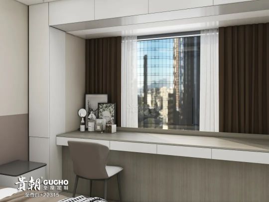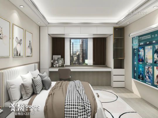在飄窗位置,特地為女主人改造了一個梳妝臺+收納柜,清晨柔媚的陽光灑落,在此梳妝打扮,足以開啟一天的好心情。而晚上躺床上,用投影儀刷劇看綜藝,更是幸福感爆棚!