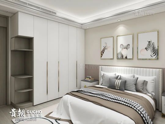 主臥沿襲了整個家的顏色搭配,至尊白衣柜一門到頂的簡約線條,搭配流線型金色長拉手,極簡格調中卻有著奢華質感。入門處則采取了明格設計,方便拿放小物。