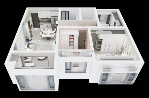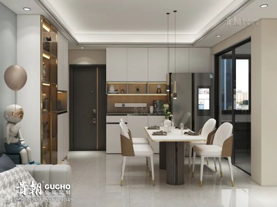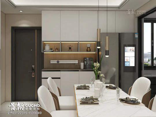入戶另一側靠近廚房的位置則設計成了餐邊柜,嵌入式冰箱盡量的節約了空間,中空開放格、免拉手設計都完全考慮到了主人日常使用需求。