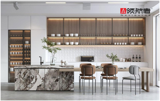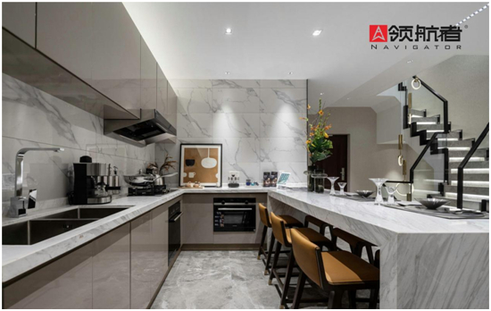 所以領(lǐng)航者采用了“隱藏式設(shè)計(jì)”,把雜亂、不常用到的東西全部收藏起來,減少臺(tái)面上用品的擺放,消除視覺上的雜亂感。廚柜加倒臺(tái)的設(shè)計(jì),也便于家人之間的互動(dòng),更是設(shè)計(jì)美學(xué)的藝術(shù)。