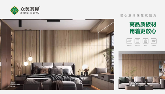 眾美其屋的6D深壓紋工藝,是勞動者智慧與機器精度的完美融合。通過德國進口尖端設備,將木紋的肌理、布藝的溫潤、皮革的質感,以微米級精度復刻于板材表面。這不僅是技術的突破,更是對自然的致敬——讓都市家庭無需遠行,便能觸摸到森林的呼吸、感受陽光的溫度。