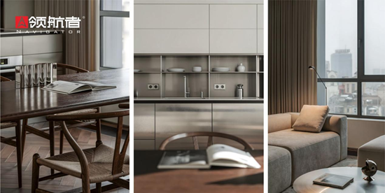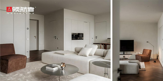 領航者定制柜是北歐色彩哲學的最佳載體,米白色的客廳定制柜用啞光質感避免強光刺眼,與墻面銜接自然,悄悄拉寬空間視覺;餐廚區的深棕色定制柜保留木紋底色,剛好呼應深色木地板,旁邊再搭配淺灰色開放格架,深淺對比間帶出細膩層次。就連角落的定制矮柜,也以“上淺下深”配色貼合整體風格,不破壞空間通透感,色彩和諧感全藏在這些定制柜的搭配里。